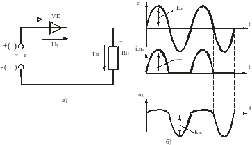 Простейшая схема для выпрямления переменного тока показана на рис. 3.11. В ней последовательно соединен источник переменного ЭДС – е, диод VD и нагрузочный резистор Rн. Эта схема называется однополупериодной.