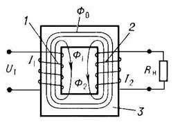 Статическое (не имеющее подвижных частей) устройство для преобразования переменного напряжения по величине. В основе действия трансформатора лежит явление электромагнитной индукции. Трансформатор состоит из одной первичной обмотки (ПО), одной или нескольких вторичных обмоток (ВО) и ферромагнитного сердечника (магнитопровода), обычно замкнутой формы. Все обмотки расположены на магнитопроводе и индуктивно связаны между собой. Иногда вторичной обмоткой служит часть ПО (или наоборот); такие трансформаторы называются автотрансформаторами. Концы ПО (вход трансформатора) подключают к источнику переменного напряжения, а концы ВО (его выход) - к потребителям. Переменный ток в ПО приводит к появлению в магнитопроводе переменного магнитного потока. В реальных трансформаторах часть магнитного потока замыкается вне магнитопровода, образуя так называемые потоки рассеяния; однако в высококачественные трансформаторы потоки рассеяния малы по сравнению с основным потоком (потоком в магнитопроводе).
