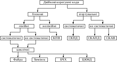 Корегуючі коди – це такі коди, в які формуються на основі інформаційної послідовності символів а1, а2... ак послідовність перевірочних символів в1, в2... вr. в кодері. За допомогою введеної збитковості декодер має можливість в залежності від вибраного коду і алгоритму декодування, виявляти чи виправляти помилково прийняті інформаційні символи, які створені в результаті дії різного роду перешкод в каналі зв’язку.