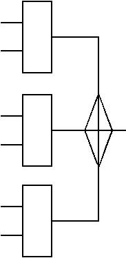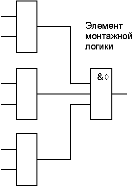 Упрощения на схеме. На схеме допускается изображать в виде прямоугольников логические элементы с n состояниями, а также элементы и устройства, не выполняющие в изделии логические функции, но применяемые в нем (например, аналоговые и аналого-цифровые элементы, диодные и резисторные сборки и т.д.). Непосредственное электрическое соединение выходов нескольких логических элементов в одну цепь (монтажная логика) допускается изображать на схеме в виде псевдоэлемента монтажной логики (рис. П.4.11).