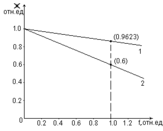 Рис.4.1. Статическая характеристика САУ по рис.3.1 при Ку=20 (линия 1) и объекта управления (линия2).