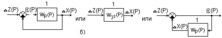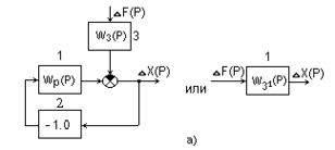 Например, на рис.3.2,а принимается Z(Р)=0, а на рис.3.2,б - F(Р)=0. При этом в схеме рис.3.2,а звено с передаточной функцией - 1.0 отражает отрицательный знак главной обратной связи замкнутой САУ. Для структурных схем рис.3.2,а эквивалентные передаточные функции соответственно имеют вид: