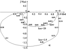 Рис.6.3. Комплексная (а) и вещественная (б) частотные характеристики САУ рис.3.1 при входном воздействии Z(t), Ку = 20 и различных значениях Koc.