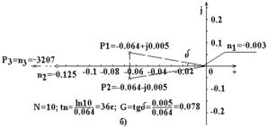 Рис.7.1. Нули (n) и полюсы (р) передаточной функции САУ рис.3.1 при входном воздействии f(t), Ку = 20, Кос = 1.0 (а) и Кос = 20 (б).