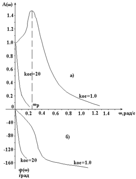 Из рис.6.4,а видно, что при Кос = 1.0 АЧХ имеет ярко выраженный максимум при частоте р = 0.26 рад/с. Это свидетельствует о колебательном характере переходной характеристики (см.рис.5.2).