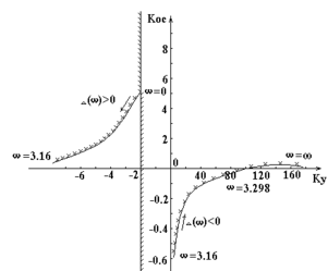 Граница Д - разбиения приведена на рис.8.1 (с целью наглядности в разных квадрантах приняты разные масштабы по осям координат). Учитывая, что в Д-разбиении фигурирует параметр 1/Ку (см.8.1), а графическое построение осуществлено относительно параметра Ку (ось абсцисс), штриховка нанесена на правую часть кривой по направлению обхода от = 0 до = при () > 0 и левую - при () < 0. Особая прямая снабжена одинарной штриховкой, направленной в сторону штриховки основной кривой.