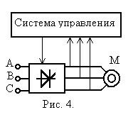 Исторически первыми появились преобразователи с непосредственной связью (рис. 4.), в которых силовая часть представляет собой управляемый выпрямитель и выполнена на не запираемых тиристорах. Система управления поочередно отпирает группы тиристотров и подключает статорные обмотки двигателя к питающей сети.
