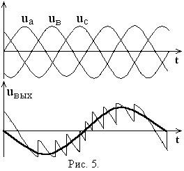 Таким образом, выходное напряжение преобразователя формируется из «вырезанных» участков синусоид входного напряжения. На рис.5. показан пример формирования выходного напряжения для одной из фаз нагрузки. На входе преобразователя действует трехфазное синусоидальное напряжение uа, uв, uс. Выходное напряжение uвых имеет несинусоидальную «пилообразную» форму, которую условно можно аппроксимировать синусоидой (утолщенная линия). Из рисунка видно, что частота выходного напряжения не может быть равна или выше частоты питающей сети. Она находится в диапазоне от 0 до 30 Гц. Как следствие малый диапазон управления частоты вращения двигателя (не более 1 : 10). Это ограничение не позволяет применять такие преобразователи в современных частотно регулируемых приводах с широким диапазоном регулирования технологических параметров.