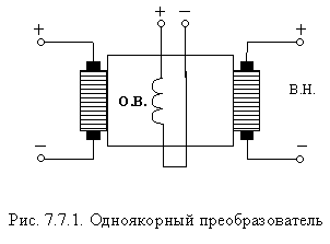 В одних и тех же пазах якоря преобразователя заложены самостоятельные обмотки низкого и повышенного напряжения. Концы обмоток присоединены к соответствующему коллектору (рис. 7.7.1), причем обмотка повышенного, напряжения имеет значительно большее число проводников, чем обмотка низкого напряжения.