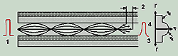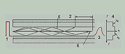 В многомодовом волокне лучи света, соответствующие различным модам, проходят различные дистанции. Если в такое волокно ввести короткий импульс света, то его лучи прибудут на противоположный конец через различные промежутки времени, и выходной импульс будет шире, чем входной. Это явление называют модовая дисперсия. Она ограничивает число импульсов в секунду, которые могут быть переданы через волокно и все еще распознающихся на противоположном конце, как отдельные импульсы. По этой причине пропускная способность волокна с шаговым индексом невелика и составляет 20 -30 МГц для кабеля длиной 1 км.