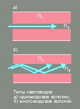 Для передачи сигналов применяются два вида волокна: одномодовое и многомодовое. Свое название волокна получили от способа распространения излучения в них. Волокно состоит из сердцевины и оболочки с разными показателями преломления n1 и n2.
