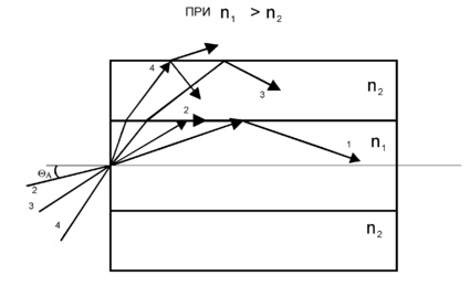 По мере увеличения угла падения со стороны оптически более плотной среды можно достичь состояния, когда приломленный луч будет скользить по границе раздела сред без перехода в оптически менее плотную среду (луч 2 рис.2).