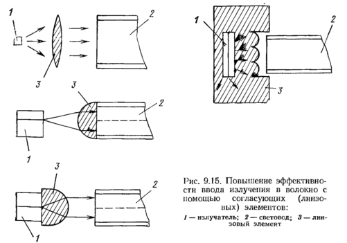 Новыми и достаточно специфическими являются элементы ввода-вывода излучения. Они выполняют функцию оптического согласования угловых апертур активных элементов (в первую очередь излучателя) и волокна. Оптимизация ввода излучения в волокно (рис. 10) может дать выигрыш по мощности до 10 дБ.