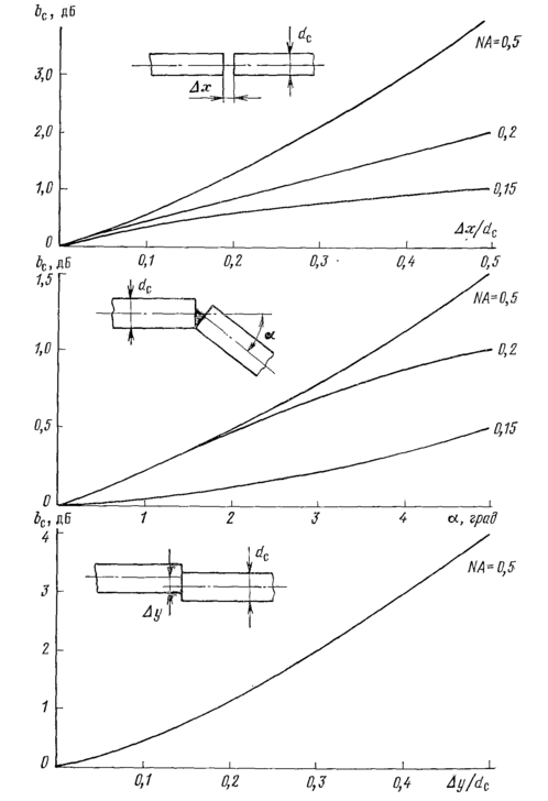 составляют неидеальность механизма соединителя (допуски при обработке деталей, истирание и усадка, различие температурных коэффициентов используемых материалов и т. п.); несовершенство используемых волокон (линейные колебания диаметра и числовой апертуры, допуски на диаметры сердцевины и оболочки, эллипсность их сечений, эксцентриситет и т. п.); технологические погрешности при заделке (армировании) конца кабеля, обусловливающие разъюстировку центров сердцевины волокна и направляющего элемента; воздействие внешних факторов (ударов, вибраций, температуры, влажности и т. п.) в процессе эксплуатации. При расчете