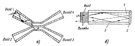 Рис. 7. Оптические двухполюсный направленный разветвитель (а) и типа «звезда» (б): 1 — сердцевина; 2 — зеркало; 3 — оболочка