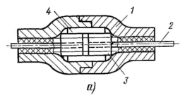Оптические соединители предназначены для многократного сочленения-расчленения концов двух отрезков кабеля (соединители типа кабель — кабель) или конца кабеля с передающим (приемным) модулем (блочные соединители). По числу одновременно соединяемых световодов они делятся на одно- и многоволоконные. В типичном одноволоконном (однополюсном) оптическом соединителе (рис. 9.12,а) конец кабеля армируется жестким калиброванным цилиндрическим элементом так, чтобы оси этого элемента и сердцевины волокна строго совпадали. В этом случае при соединении цилиндрические элементы совмещаются с помощью направляющей муфты, автоматически обеспечивая и совмещение осей волокон. В многоволоконных (многополюсных) соединителях (рис. 9.12,6) чаще всего используют конструкцию с У-образными канавками, в которых и размещаются отдельные световоды. Кроме соединителей линейного типа (рис. 5) известны матричные с числом одновременно сочленяемых световодов .до 100... 150. Заметим, что число разновидностей опторазъемов, отличающихся друг от друга принципом сведения сочленяемых элементов, чрезвычайно велико: число наименований патентной литературы по этому направлению превышает несколько тысяч.
