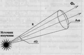 - телесный угол, имеющий в вершине источник излучения, определяется как отношение площади сферической поверхности