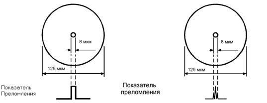 в) Одномодовое волокно волокно со смещенной дисперсией или NZDSF (справа)