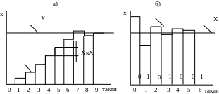 в кожному такті або на різних ділянках змінюється неоднаковими східцями. "Вагу" цих східців вибирають згідно з тією чи іншою системою числення, звичайно двійковою або двійково-десятковою. На рис. 3, б показано розгортку зразкової величини