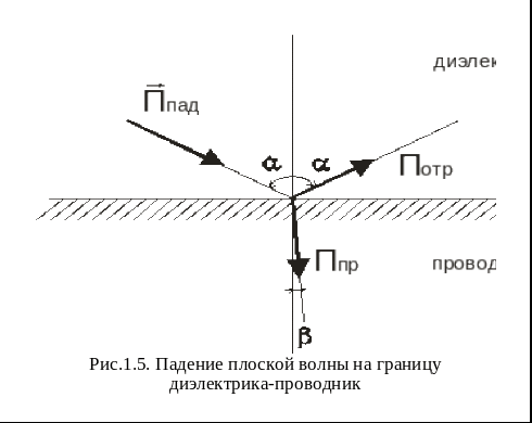 В результате возникает волна, отражённая и преломлённая, уходящая вглубь проводника. Можно показать, что в проводниках угол преломления β≈0, независимо от угла падения, т.е. преломленная волна уходит в проводник почти по нормали к границе раздела сред (рис. 1.5)