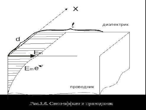 В проводнике α значительно выше, чем в диэлектрике, поэтому амплитуда колебаний Е быстро уменьшается по мере проникновения поля в глубину проводника. То же действительно и для напряжённости магнитного поля Н. В результате, в проводнике электромагнитное поле расположено в достаточно тонком поверхностном слое.