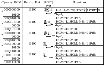 0=0. Послідовність дій, виконуваних у процесі множення, наведено в табл. 3.5.
