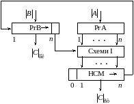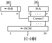 Для реалізації даного методу множення потрібні (рис.3.5) п-розрядний регістр множеного РгА, п-розрядний регістр множника РгВ з колами для зсуву вліво, п схем І і 2п-розрядний нагромаджувальний суматор НСМ з колами для зсуву вліво. Тут множене завжди додається до п молодших розрядів суми часткових добутків.