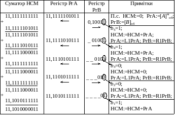 Розв'язання. Для даних чисел маємо: [А]моб=11,01011; [В]об= 0,10011. Оскільки B>0, то поправки не додаються. Послідовність дій, що виконуються в процесі множення, подані у вигляді табл. 3.8.