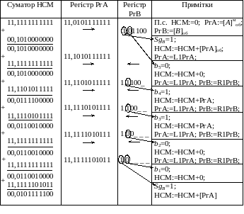 Приклад 3.5. Описати множення чисел А = 0, 11100 і В = 0, 10011, що реалізується модифікованим пристроєм.