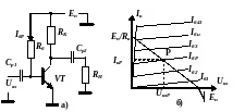 Для обеспечения режима работы класса А, необходимо установить соответствующие этому режиму токи электродов. Наиболее просто это получается, если задаться расположением рабочей точки, точки покоя, примерно на середине линии нагрузки (рисунок 4.3, б). Линия нагрузки данной схемы проводится в системе координат выходной характеристики пранзистора Uкэ и Iк через точки на осях координат Еп и Еп / Rк. Рабочая точка Р характеризуется коллекторным током IкР и напряжением на коллекторе UкэР.