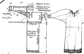 Отделкой являлись и притачные клинья в нижней части рукавов. Притачные клинья располагались по обе стороны основной части рукава. Клин со стороны локтевой части рукава, как правило, был небольшим. Клин со стороны переднего переката рукава был значительно больше и кроился из более тонкой ткани, а чаще был другого цвета. Притачная линия клина со стороны переднего переката рукава была значительно короче другой стороны этого клина, чем способствовала направлению рукава вперед. Кроме того, она удлинялась против локтевого среза на величину цельнокроеной ластовицы.