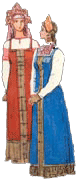 Основой женского костюма являлась рубаха, отличавшаяся мужской только большей длиной (доходила до ступней). Богатые женщины носили одновременно две рубахи - исподнюю и верхнюю, причем верхнюю шили из дорогих тканей. Рубаха могла гладко облегать шею, но могла быть также собрана у ворота в густую сборку и обшита узкой каймой. Носили рубаху с нешироким поясом, часто вышивали орнаментом. Поверх рубахи замужние женщины обычно носили поневу - юбку, запахнутую вокруг фигуры. Эта юбка состояла из трех сшитых между собой полотнищ и крепилась вокруг талии шнуром - гашником. Поневу часто шили из пестрых тканей.