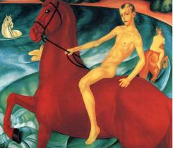 Новаторство Петрова-Водкина основано на постижении им искусства современного и предшествующих эпох, прежде всего творчество импрессионистов и Матисса, и традиций древнерусского искусства (вспомните хотя бы известную икону Новгородской школы XV в. «Чудо Георгия о змие»), которое владело богатыми средствами изображения вечного, духовного, чистой нравственности. Четко очерченный силуэт предметов, локально закрашенные поверхности, отказ от законов перспективы и от изображения объемов, особое использование цвета – знаменитое «трехцветие» Петрова-Водкина присутствуют в этом этапном для художника полотне, выявляя своеобразие его художественного языка. В народных сказках также присутствует образ всадника на Красном коне. Слово «красный» в русском языке имеет широкое значение: красный – прекрасный, что значит не только красивый, но и добрый; красна – девица.