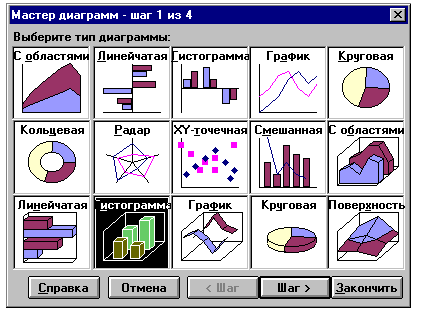 Можна змінювати тип діаграми або комбінувати різноманітні їх типи, клацаючи мишею на кнопці — «Тип диаграмм» панелі інструментів. Натискання на цю кнопку виводить на екран палітру типів діаграм, запропонованих вам на вибір.