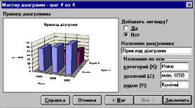 Невеличкий квадратик коло діаграми називається легендою, де наведені відповідні кольори і назви відповідних рядів. Останнє четверте вікно як раз і дозволяє вставляти чи викидати цю легенду. Крім того тут можна також уставити заголовок діаграми, підписати всі.