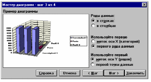 Серія даних, розташована уздовж вісі Х, називається рядом, уздовж вісі Y — категорією. Верхній вибір третього вікна «Ряды данных ... в строках, ... в столбцах» дозволяє міняти ряди й категорії місцями.