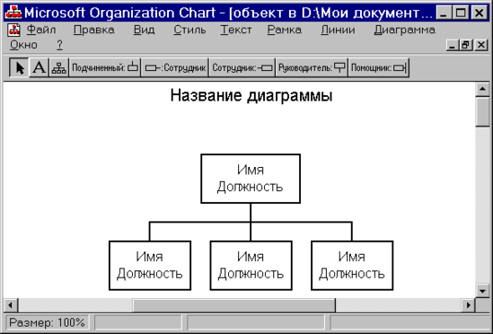 Щоб вставити в текст документу організаційну діаграму, виконайте команду «Объект » у меню «Вставка », а потім виберіть пункт «MS Orga-nization Chart». Після цього з’являється екран редактора діаграм (див. далі). У вікні редактора зображено найпростішу заготовку для подальшої роботи, яка складається із заголовку, одного прямокутника верхнього рівня і трьох прямокутників нижнього рівня. В кожному прямокутнику діаграми може знаходитись до чотирьох рядків пояснювального тексту, перші два з них умовно названі: «Имя», «Должность». Якщо клацнути мишею у вільному місці діаграми, у прямокутнику залишиться тільки введена інформація.