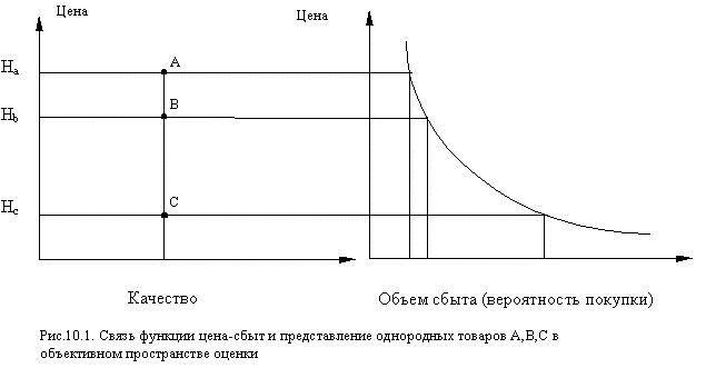 Для каждого уровня качества и для каждой категории продуктов имеется своя "стандартная цена" (рис.10.1)[8]. Она возникает в результате субъективной переработки информации о ценах и может не соответствовать ни одной реальной цене. Предположим, что товары А,В и С (рис.10.1) воспринимаются как одинаковые, с точки зрения качества, но цены продуктов различны. Тогда, исходя из принципа рациональности, будет выбран продукт с наиболее низкой ценой (функция "цена-сбыт" в микроэкономической теории). Правда, тщеславие заставляет людей покупать более дорогие продукты (Veblen - эффект).