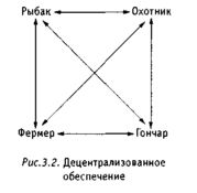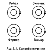 Чтобы разобраться в природе рынка, представим примитивное экономическое сообщество из четырех человек: рыбак, охотник, гончар, фермер. На рисунке представлены три способа удовлетворения этими людьми своих нужд: