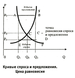 При вищій ціні Р2 утворюється надлишок пропозиції над попитом (відрізок АВ), що в ході конкуренції продавців сприятиме зниженню ціни. Якщо ж ціна P1 буде нижча, ніж ціна рівноваги, то попит перевищує пропозиція (відрізок EF). Цей надлишок попиту і конкуренція покупців сприятимуть підвищенню ціни. Тільки у точці З досягається рівновага попиту і пропозиції і, отже, стійка ціна рівноваги
