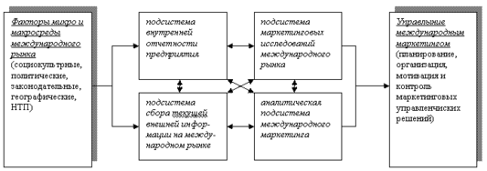 - подсистема маркетинговых исследований международного рынка: способы связи с определенным зарубежным рынком и внутренней средой предприятия, которые предоставляют возможность оперировать информацией, получение которой требует проведения отдельного исследования;