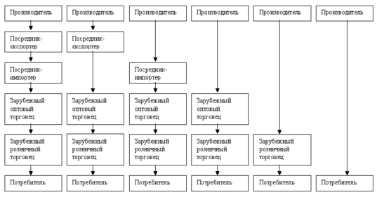 Чем уже канал, тем меньше участников сбыта. Международные каналы товародвижения выглядят, как правило, следующим образом (рис.10.1).