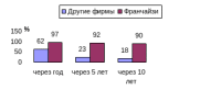Франчайзинг действует на основе долговременных партнерских отношений между крупной "материнской" компанией (франчайзер) и фирмой-оператором, реализующей продукцию (франчайзи). Фирма франчайзи (дистрибьютор) имеет право пользоваться торговой маркой, обучать персонал в головной компании, но обязана соблюдать политику цен и действующие стандарты качества товара этой компании. Капитал предприятия-оператора создается за счет головной организации или путем предоставления кредита; расчеты с головной организацией производятся за полуфабрикаты или готовую продукцию, реализуемую под торговой маркой франчайзера. Яркий пример франчайзинга — компания "Макдоналдс", передающая владельцам ресторанов отлаженную технологию и мобильную рекламу. Франчайзинг существенно увеличивает выживаемость "дочерних" фирм и их экономическую эффективность, что хорошо иллюстрирует диаграмма, приведенная "АиФ" (№ 9, 1998 г.).