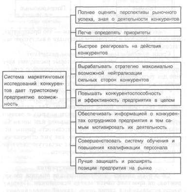 Практически все выдающиеся маркетинговые успехи фирм основываются на концепции собственных лучших сил против слабых мест конкурентов. Сделать это удается лишь при хорошо налаженной системе их исследования. Такая система обеспечивает туристскому предприятию ряд преимуществ (рис.1.).