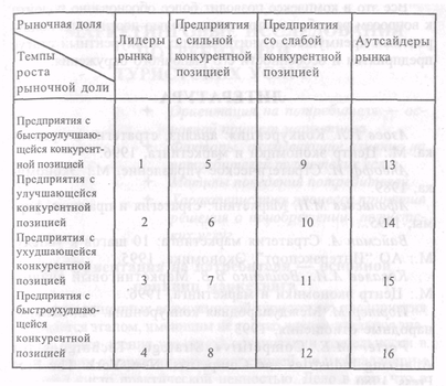 Конкурентная карта рынка (табл.1.) строится, исходя из перекрестной классификации размера и динамики рыночной доли предприятий. Это позволяет выделить 16 типовых положений предприятий, отличающихся степенью использования конкурентных преимуществ и потенциальной возможностью противостоять давлению конкурентов. Наиболее значимым положением обладают предприятия 1-ой группы (лидеры рынка с быстроулучшающейся конкурентной позицией), наиболее слабым - аутсайдеры рынка с быстроухудшающейся конкурентной позицией (16-ая группа).