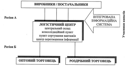 Розвиток систем дистрибуції товарів "породив" такий специфічний елемент як "логістичні центри дистрибуції". Концепція логістичного центру зображена на рис. 10.2.