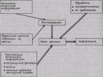 Система маркетинговой информации. Хотя вторичные источники информации богаты и разнообразны, они не позволяют собрать все данные, необходимые предприятию для знания иностранных рынков, поэтому требуется дополнительная или уточненная информация, собранная на местах. Исследования рынка — лишь один из компонентов работы по сбору информации. Как правило, они интегрируются в глобальную систему информации, где различные источники, находящиеся под контролем предприятия, используются в соответствии с его потребностями. Когда предприятие уже представлено на рынке, ему следует прибегнуть к помощи своего зарубежного и местного персонала, своих агентов по сбыту или даже, в рамках соглашения о сотрудничестве, своих привилегированных клиентов (рис.3).