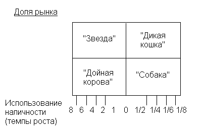 Упрощенная методика определения положения фирмы и ее товаров по отношению к возможностям отрасли была разработана Бостонской консультативной группой. При анализе портфеля (набора вариантов) инвестиций проводится сравнение доли фирмы или ее товаров на рынке с темпами роста всей хозяйственной деятельности.