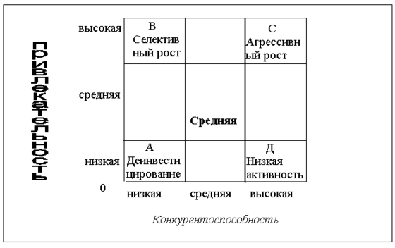 По каждому измерению представленному на рисунке матрицы предлагается три уровня: низкий, средний, высокий, что дает 9 комбинаций, каждая из которых отвечает особой стратегической позиции. Четыре наиболее характерные позиции находятся по углам матрицы.