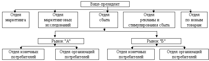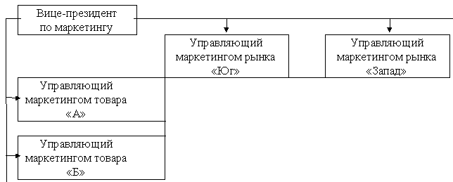 При такой схеме оптимально учитываются потребности покупателей на конкретных сегментах рынка. Основные рынки закрепляются за управляющими по рынкам, последние сотрудничают со специалистами функциональных подразделений в разработке планов по различным направлениям функциональной деятельности.